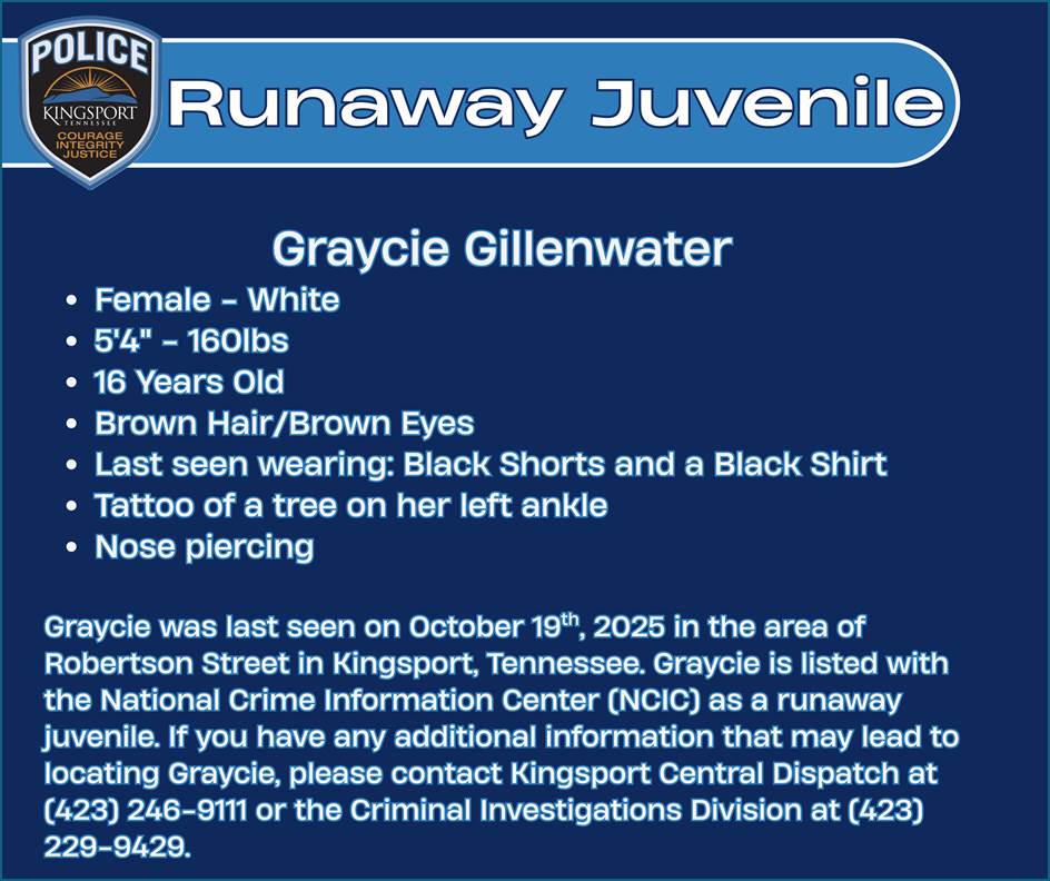 If you have any information that could assist this investigation, please contact our Detective Division immediately at (423) 229-9429 or submit tips online using the Citizen Feedback forms at: https://www.kingsporttn.gov/city-services/police-department/contact-police/#tab-id-2.