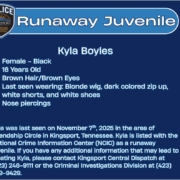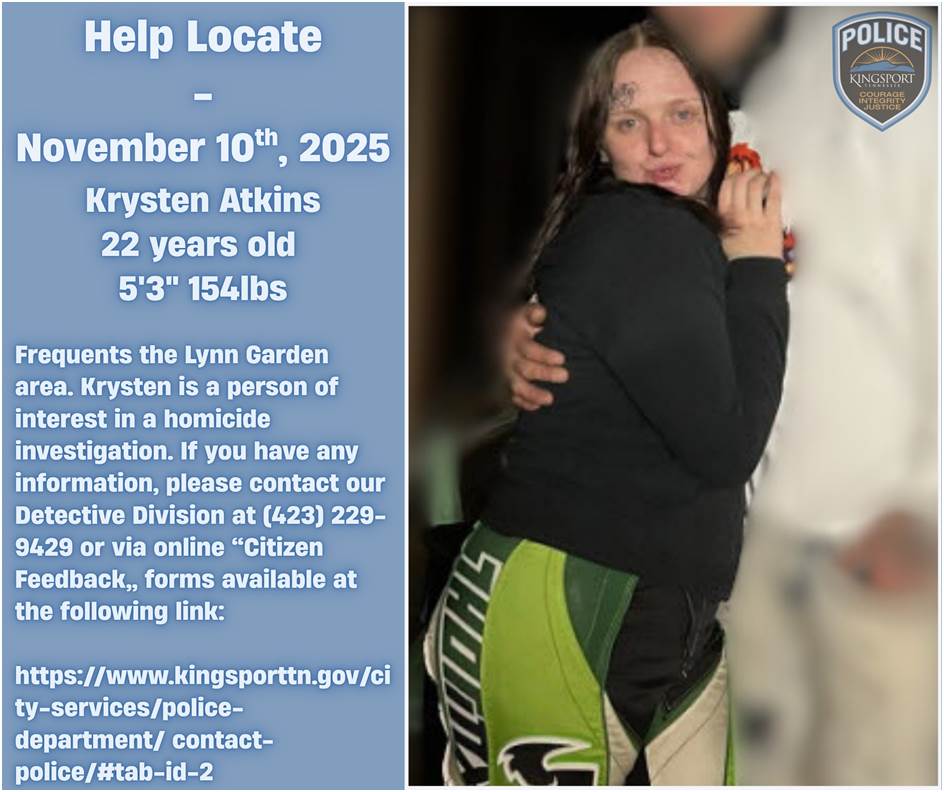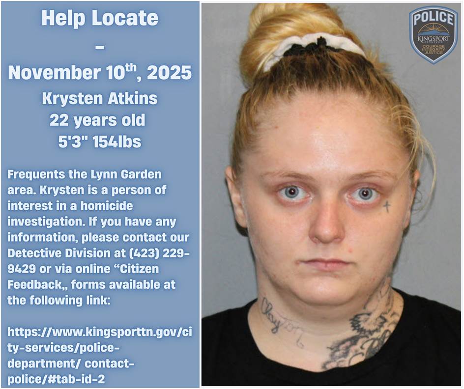The Kingsport Police Department is searching for Krysten Atkins, 22, white female, 5’3″, 154 lbs, and Tyler Holly, 33, white male, 5’10”, 150 lbs. Both are persons of interest in an active and ongoing homicide investigation and are known to frequent Lynn Garden Drive.