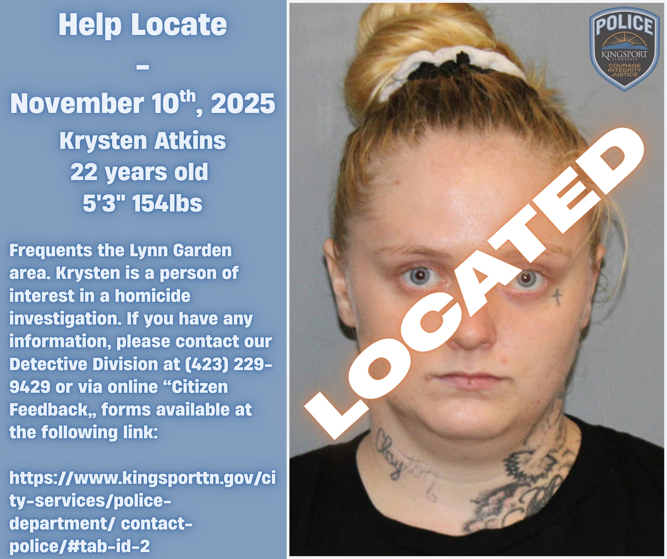 Krysten Atkins and Tyler Holly have been located. The Kingsport Police Department would like to thank the public for their assistance.