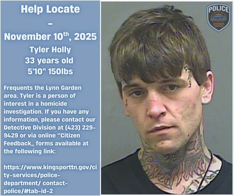 In the early morning hours of Monday, November 10th, 2025 (11/10/2025), Patrol Officers with the Kingsport Police Department responded to an address on Sky South Road after receiving a 9-1-1 call about gunshots with an individual lying on the ground. Once on scene, officers located a thirty-seven-year-old (37) white male who was deceased. The male was identified as Johnathon Reed. Detectives with the Kingsport Police Department responded to take over the investigation and process the crime scene. During their investigation, Krysten Atkins and Tyler Holly were identified as persons of interest in the incident.