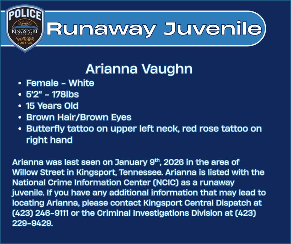 Anyone with information on Arianna’s whereabouts is asked to contact Kingsport Central Dispatch at (423) 246-9111 or the Criminal Investigations Division at (423) 229-9429.