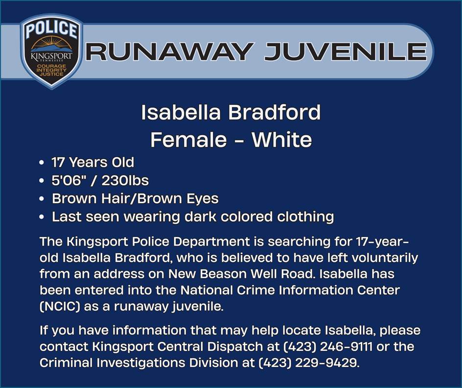 - Seventeen-year-old (17) Isabella Bradford is originally from Knoxville, Tennessee. Isabella is a white female with brown hair and brown eyes; she is about 5’6″ tall and 230 pounds.