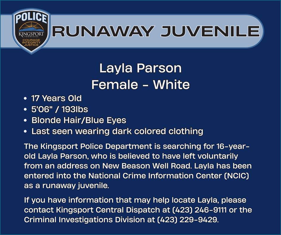 - Seventeen-year-old (17) Layla Parson is originally from Nunley, Tennessee. Layla is a white female with blonde hair and blue eyes; she is about 5’6″ tall and 193 pounds.