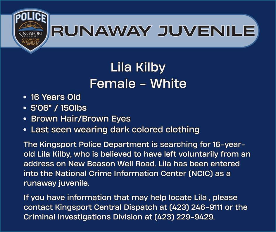 - Sixteen-year-old (16) Lila Kilby is originally from Harriman, Tennessee. Lila is a white female with brown hair and blue eyes; she is about 5’6″ tall and 150 pounds.